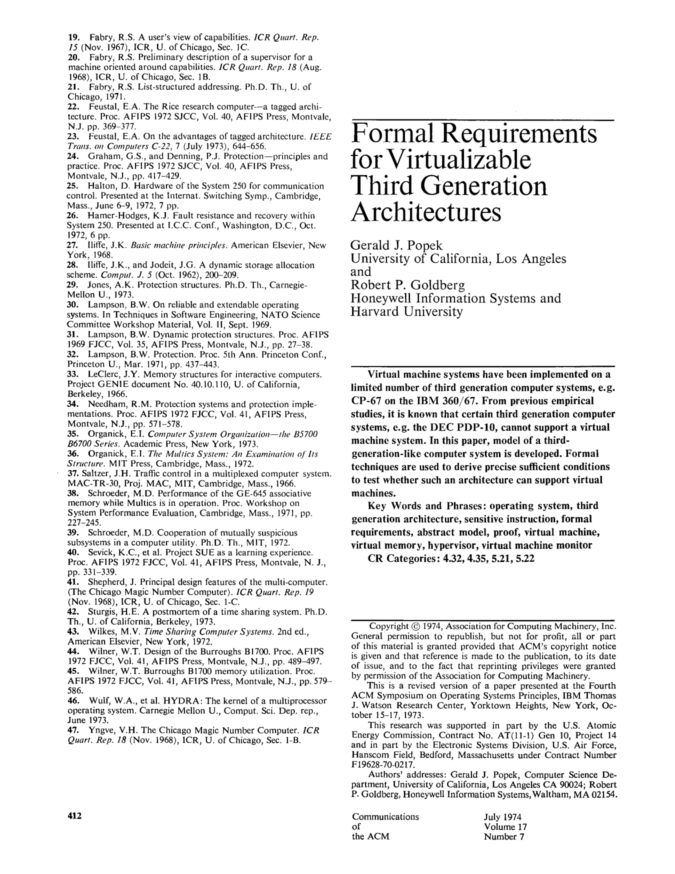 In 1974 a seminal paper on the topic of virtualisation was published: Formal Requirements for Virtualizable Third Generation Architectures.
