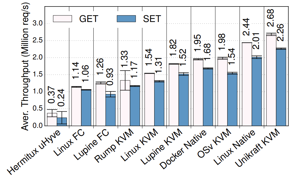 The graph shows the throughput for Redis, which is a very popular key value store, in millions of requests per second. There are various setups on the X axis including different unikernels, as well as vanilla Linux. As you can see Unikraft is the fastest solution: even if it runs virtualised on top of Qemu/KVM, it is still a bit faster than Linux non-virtualised, and also much faster than Linux in a VM. Feel free to check out the paper for more performance evaluation.